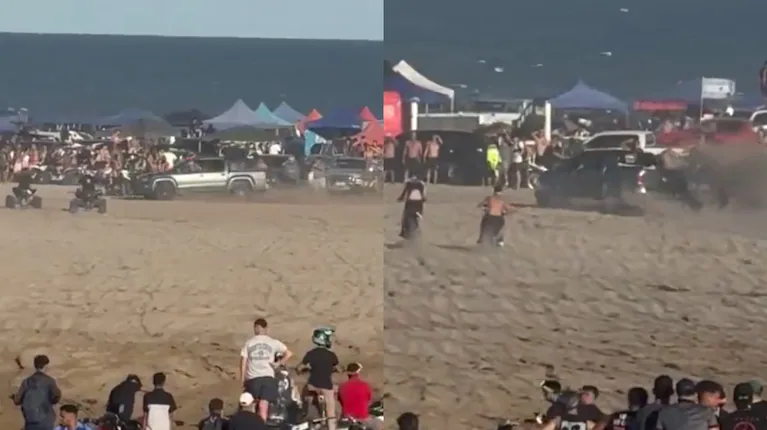 Las imágenes, que no tardaron en circular por las redes sociales, muestran la potencia de la camioneta acelerando a fondo sobre la arena en lo que pareciera una especie de “picada” contra motos y un vehículo UTV.