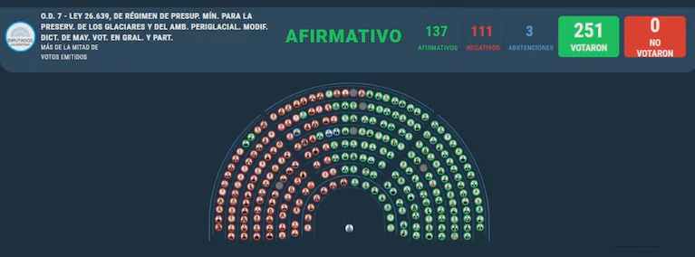En una sesión histórica de más de 10 horas, el oficialismo logró aprobar la modificación de la Ley de Glaciares. La iniciativa obtuvo 137 votos a favor, 111 en contra y tres abstenciones en la Cámara de Diputados.