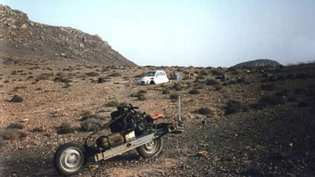 “Partió a la tarde siguiente, dejando las piezas que no usaría en la carrocería del 2CV -dice un artículo escrito en la revista 2CV Magazine-. Llevó consigo el resto de su comida (más de un litro y medio de agua), la cama, la caja de herramientas, sin olvidar los mapas y la brújula. Un pequeño colchón de espuma y una toalla cosida le servirían de tienda de campaña”.
