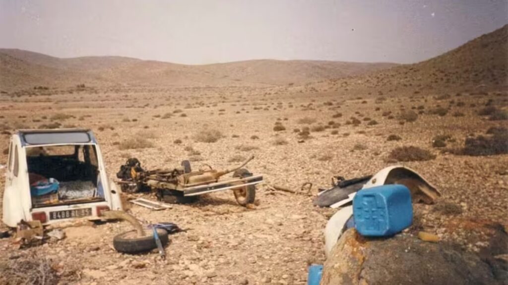 Decidió continuar campo travieso, rodeando el puesto de control. Aquí el capricho: insistir con su empresa hacia destino por fuera de la ruta, sobre una vía pedregosa. Pero una roca, un don y la inmensidad del Sahara se apoderaron de su suerte los próximos doce días. Una piedra había destrozado el brazo de la suspensión delantera derecha: el automóvil quedó inservible. Estaba a la intemperie, a medio día de caminata de la ciudad, con diez días de víveres y un bien valioso que no quería abandonar a merced del desierto, susceptible al robo.