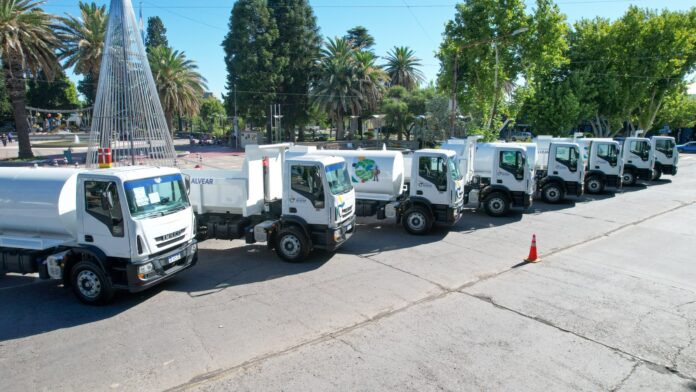 El intendente de General Alvear, Alejandro Molero, encabezó la presentación de los nuevos camiones adquiridos por el municipio, realizada frente al edificio municipal sobre avenida Alvear Oeste, donde se exhibieron ocho de los doce camiones que forman parte del proceso de renovación del parque automotor.