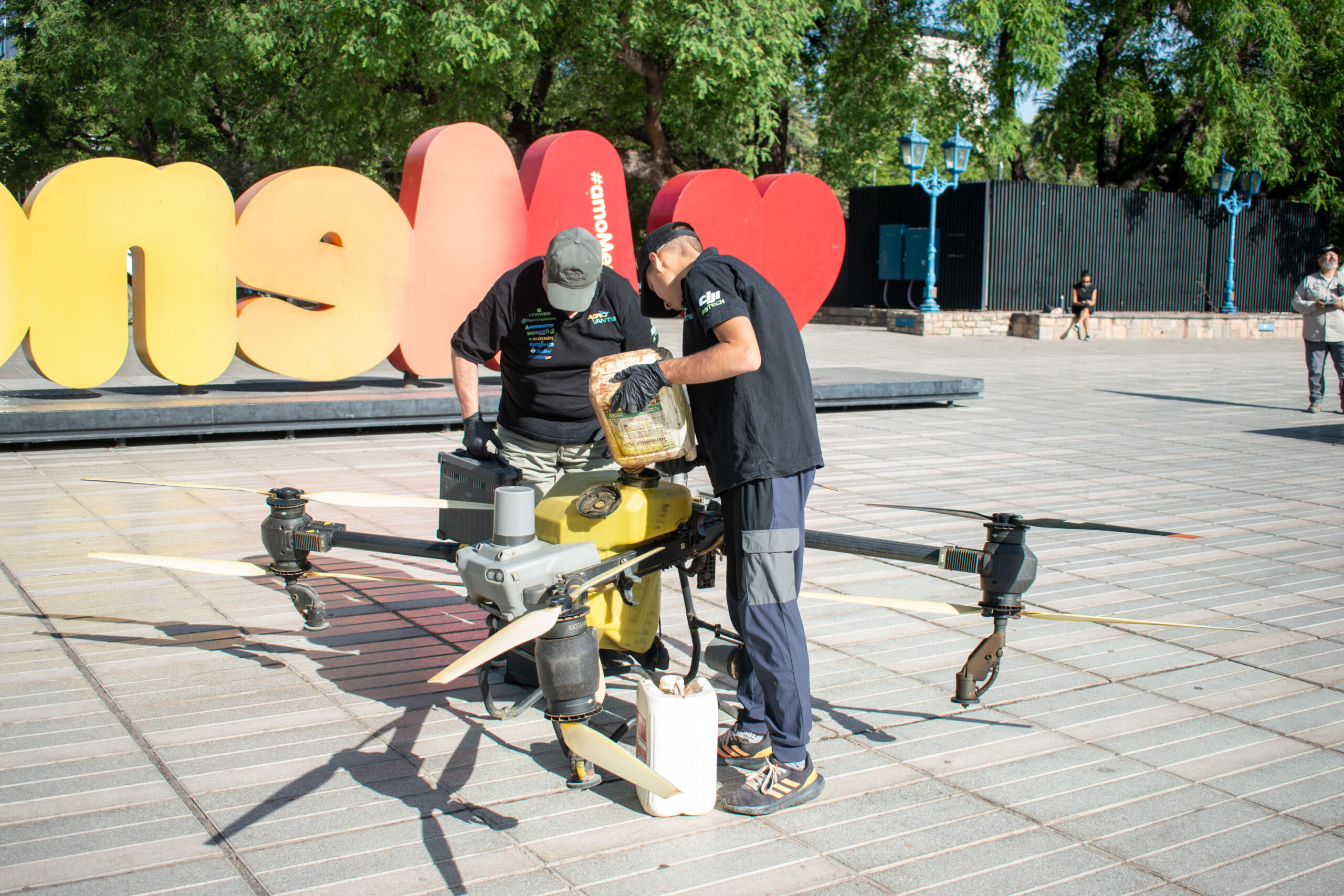 Concretamente, el operativo se orientó a mitigar la plaga conocida como Psilido, que afecta a las tipas y genera secreciones azucaradas que provocan un “pegote” en veredas y calzadas, dificultando el disfrute de las plazas. La intervención se ejecutó con equipos alquilados a la empresa mendocina Agro Vants, utilizando productos orgánicos autorizados para uso urbano. La pulverización con drones es un sistema completamente innovador y sustentable con amplios beneficios respecto al tradicional.
